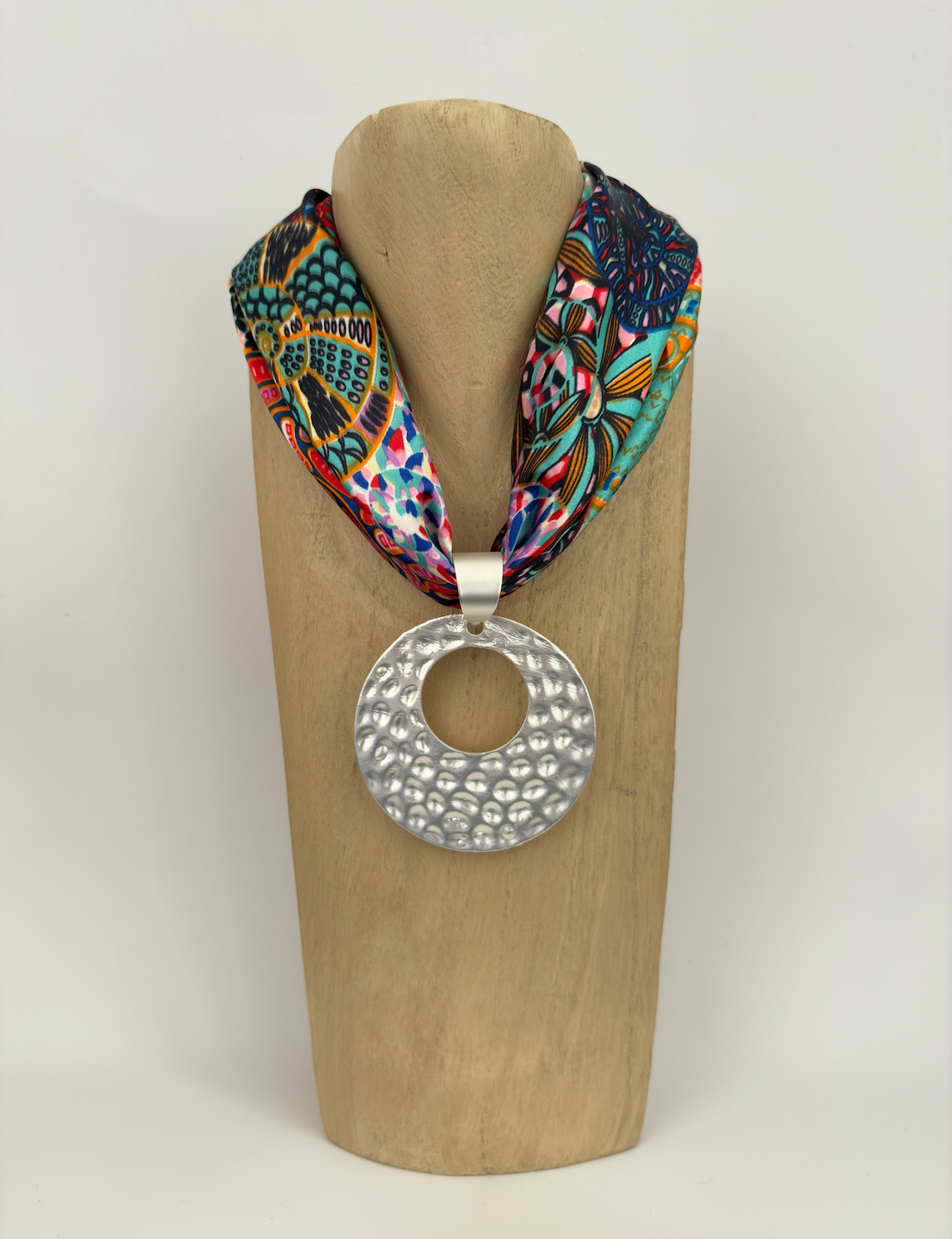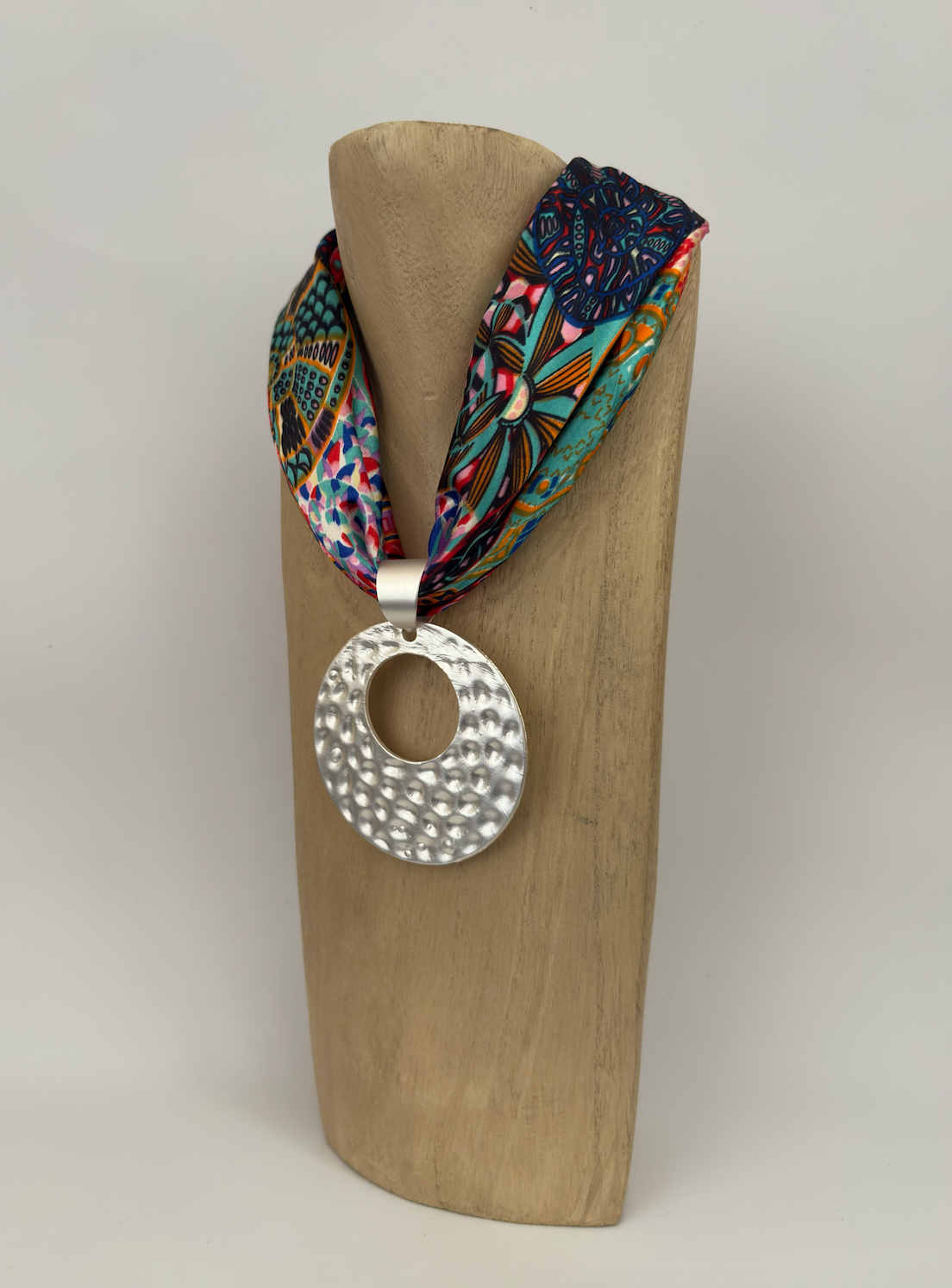 A: Each necklace is hand-assembled, so the placement of the fabric may vary slightly from the photos. However, the scarf used is always the exact same one shown on the website.