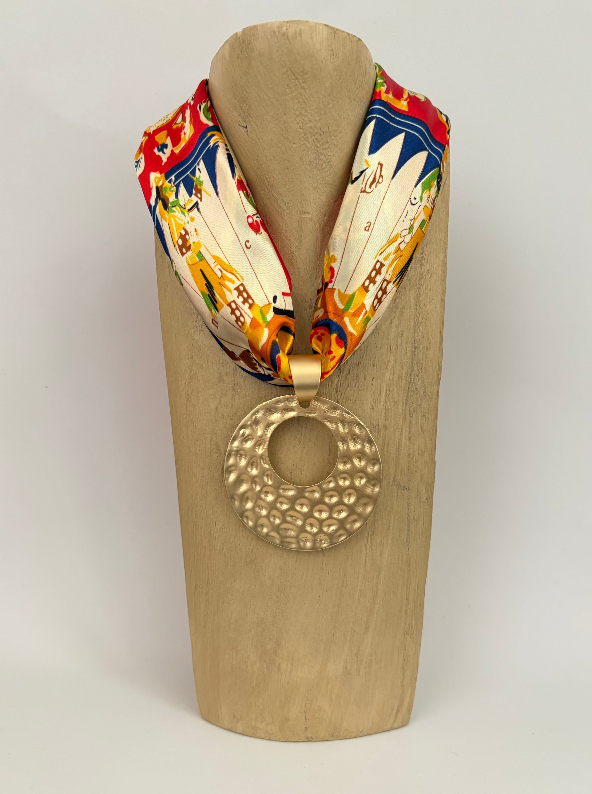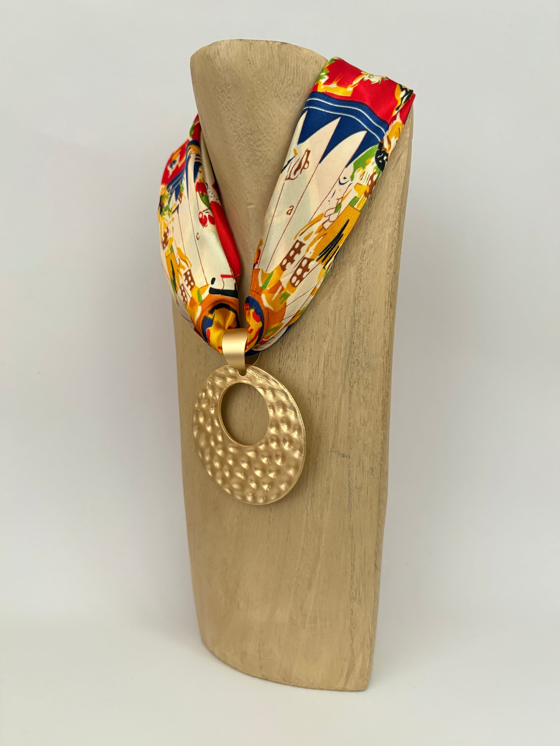 A: Each necklace is hand-assembled, so the placement of the fabric may vary slightly from the photos. However, the scarf used is always the exact same one shown on the website.