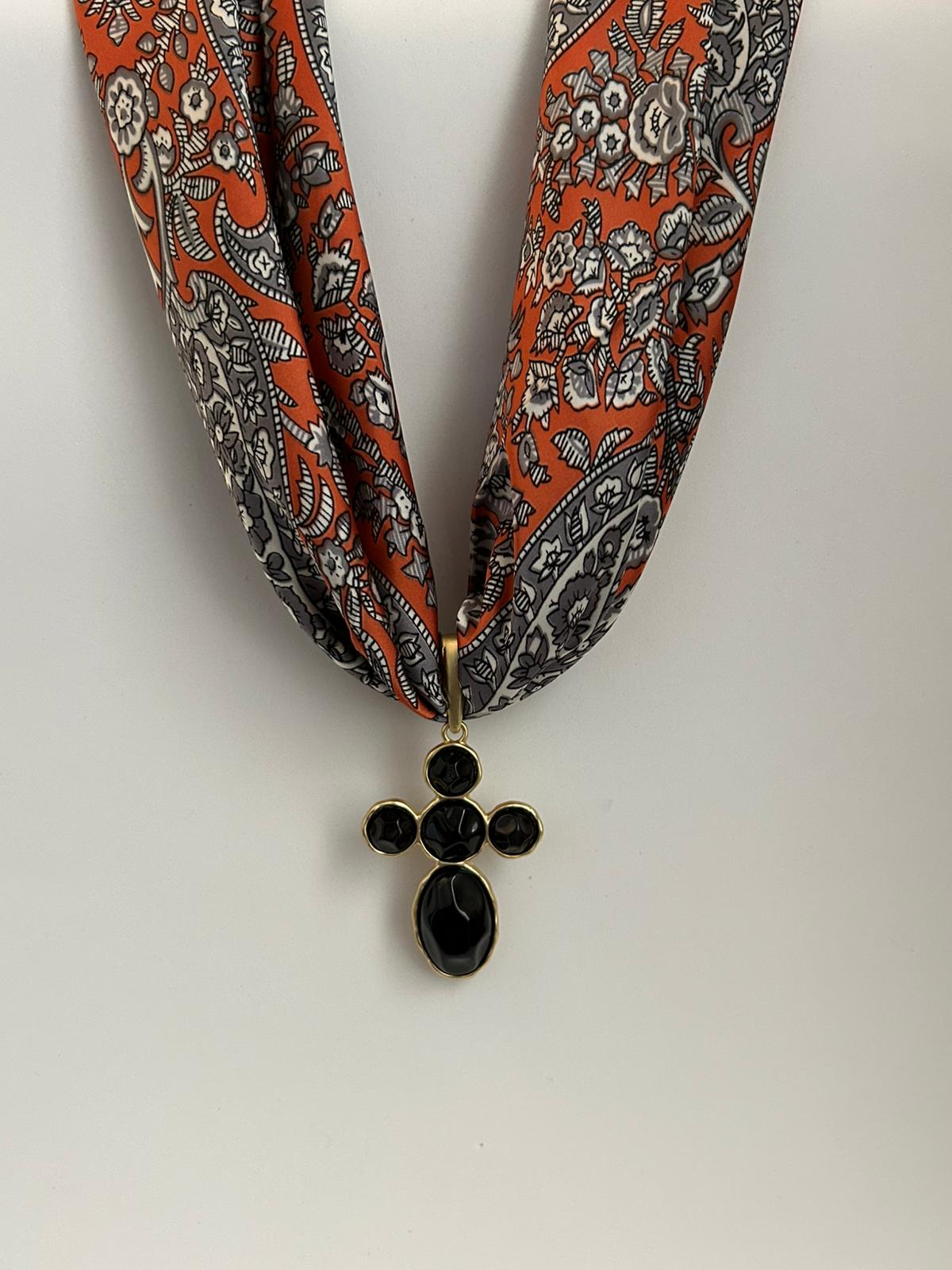 A: Each necklace is hand-assembled, so the placement of the fabric may vary slightly from the photos. However, the scarf used is always the exact same one shown on the website.