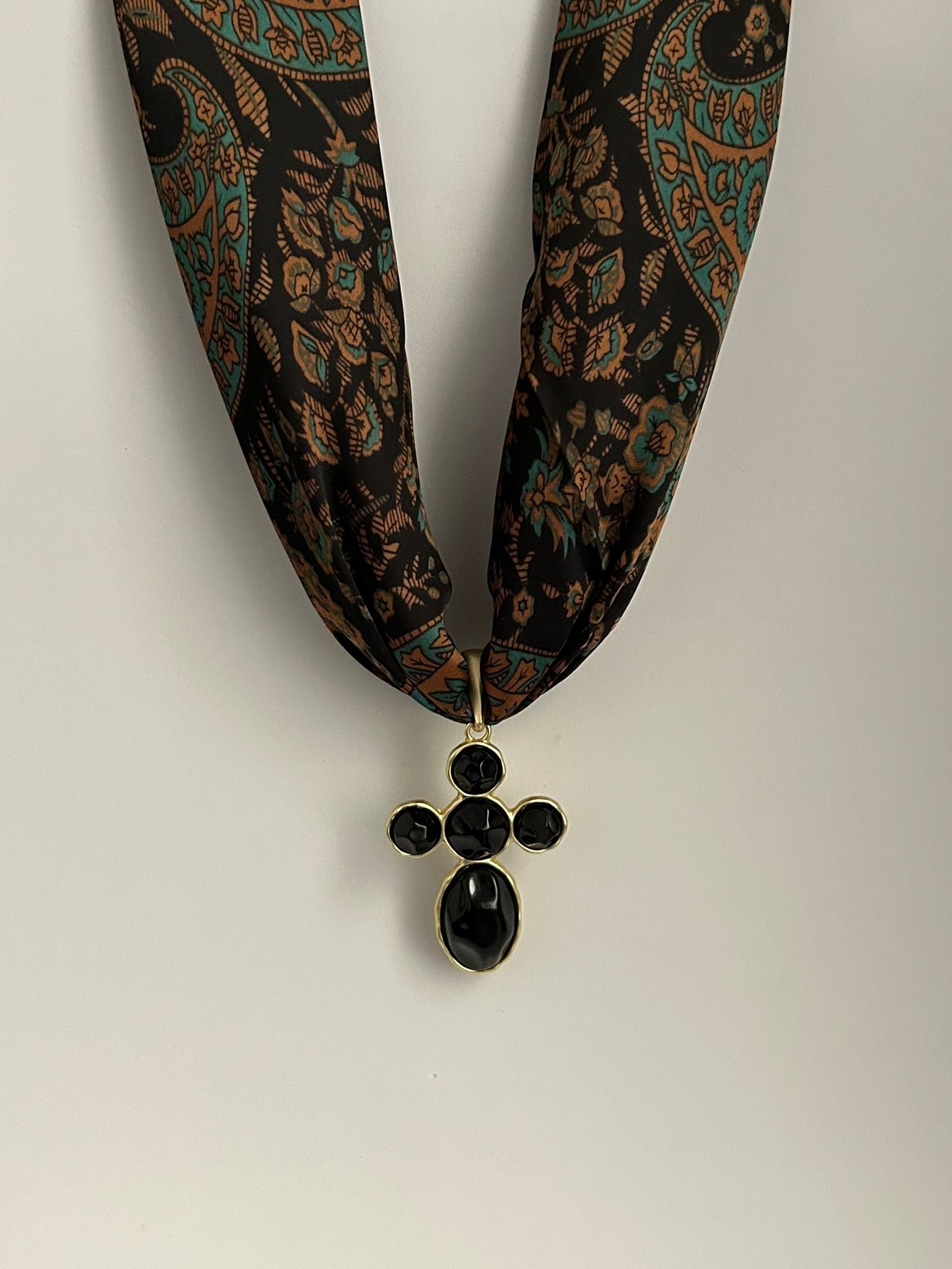 A: Each necklace is hand-assembled, so the placement of the fabric may vary slightly from the photos. However, the scarf used is always the exact same one shown on the website.