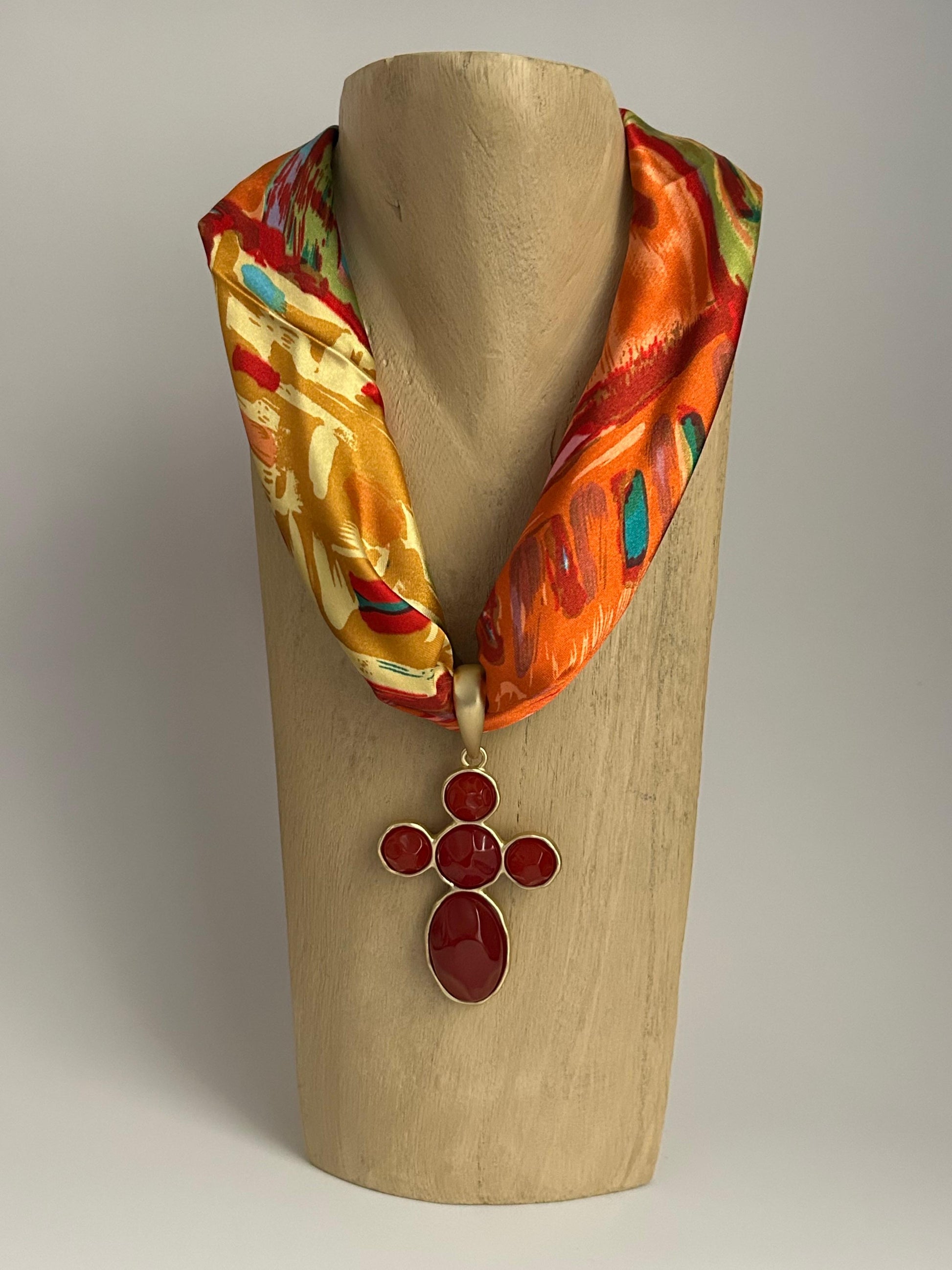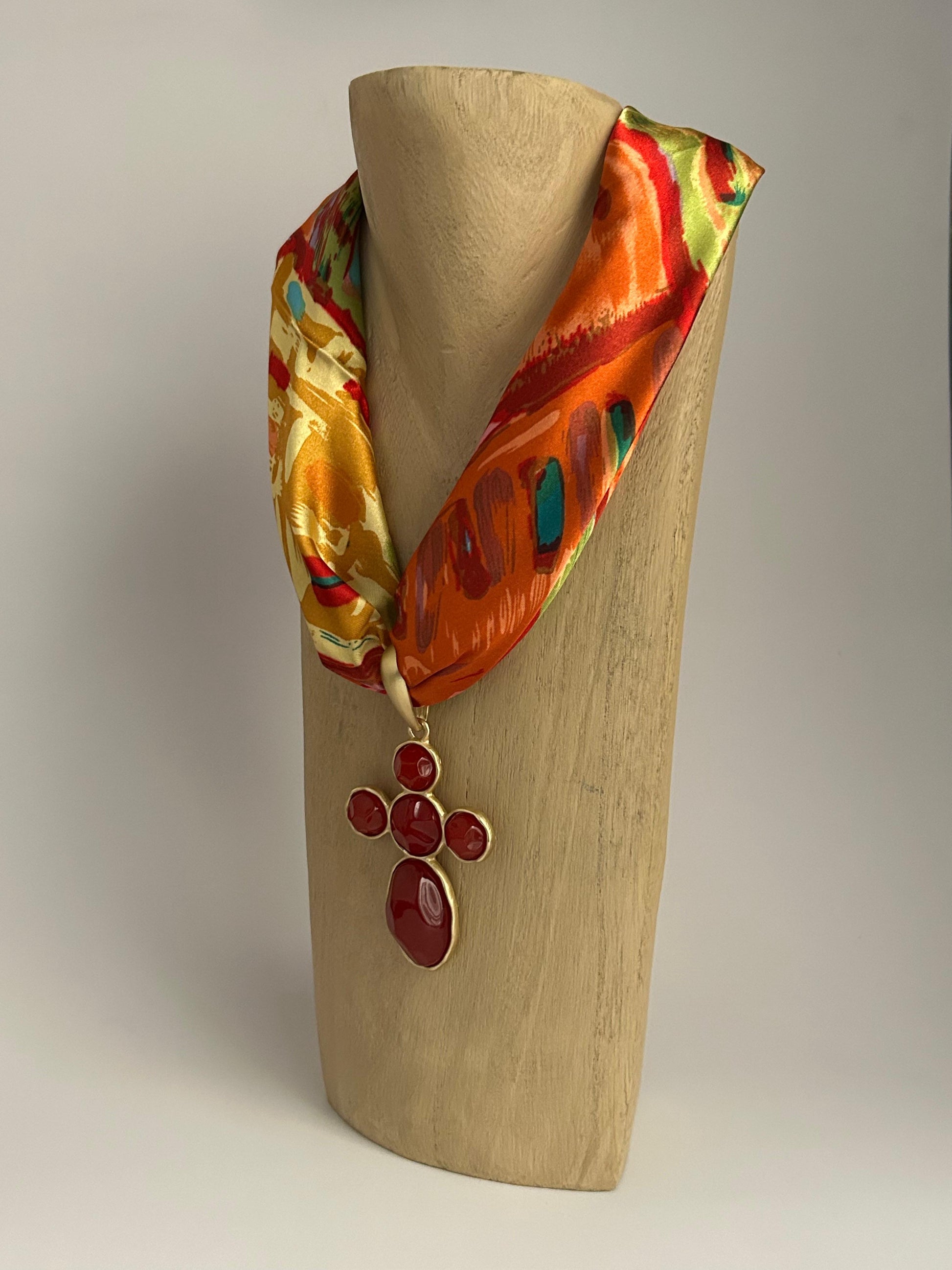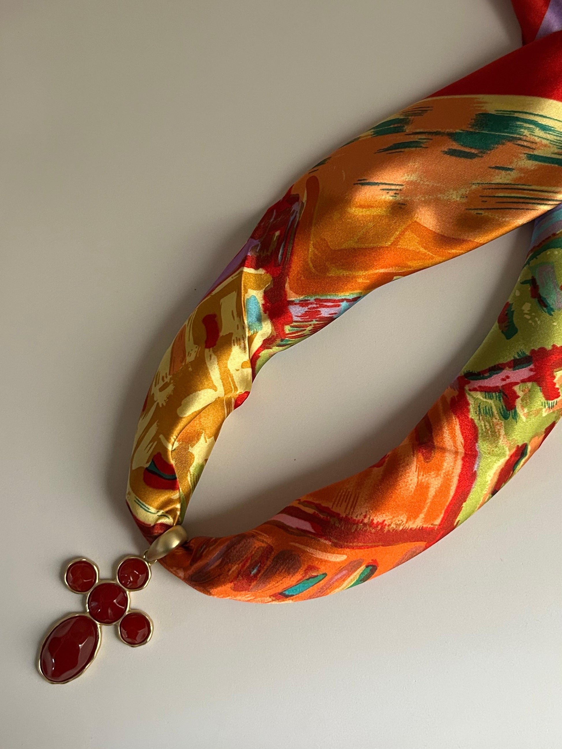 A: Each necklace is hand-assembled, so the placement of the fabric may vary slightly from the photos. However, the scarf used is always the exact same one shown on the website.