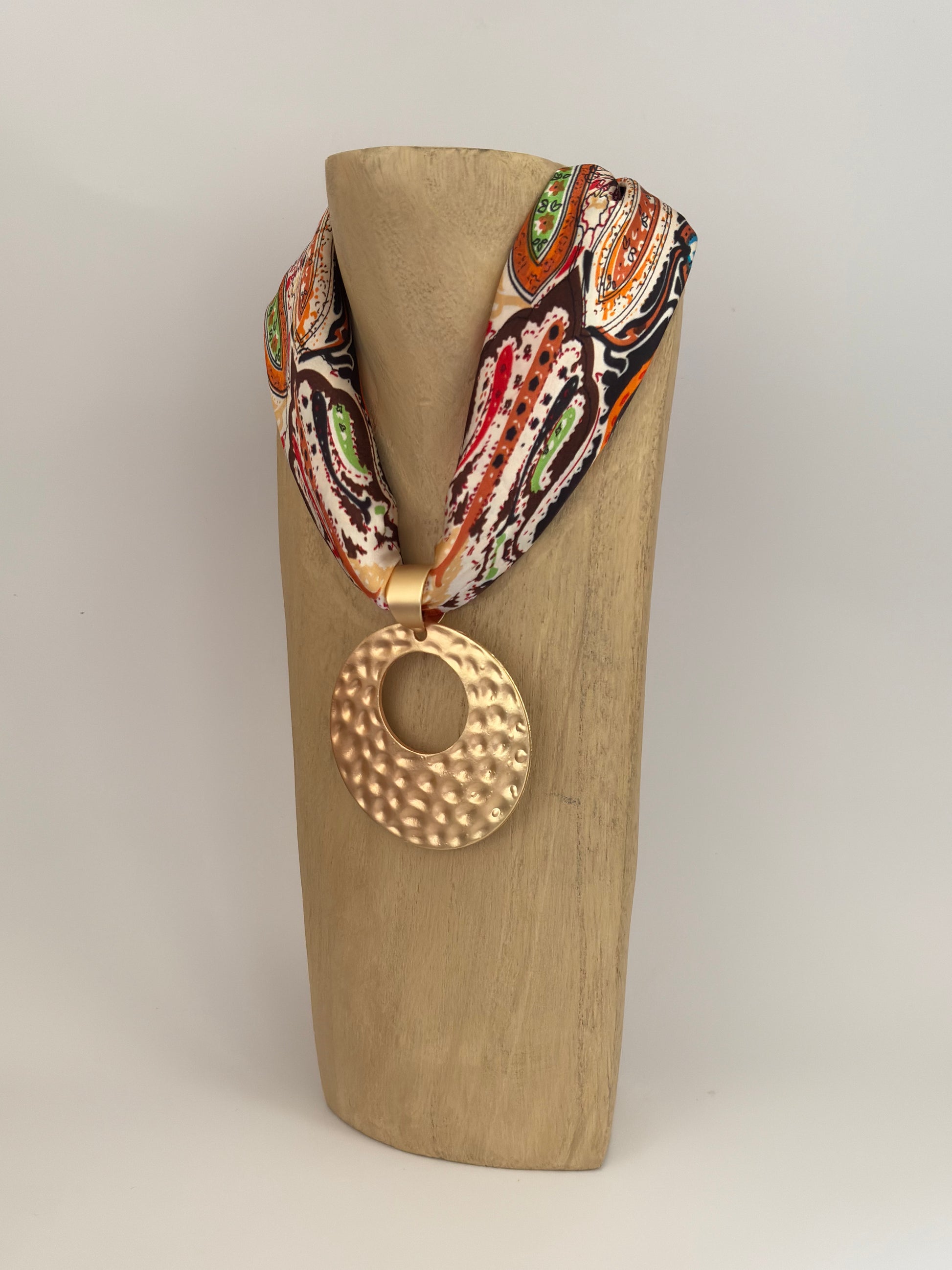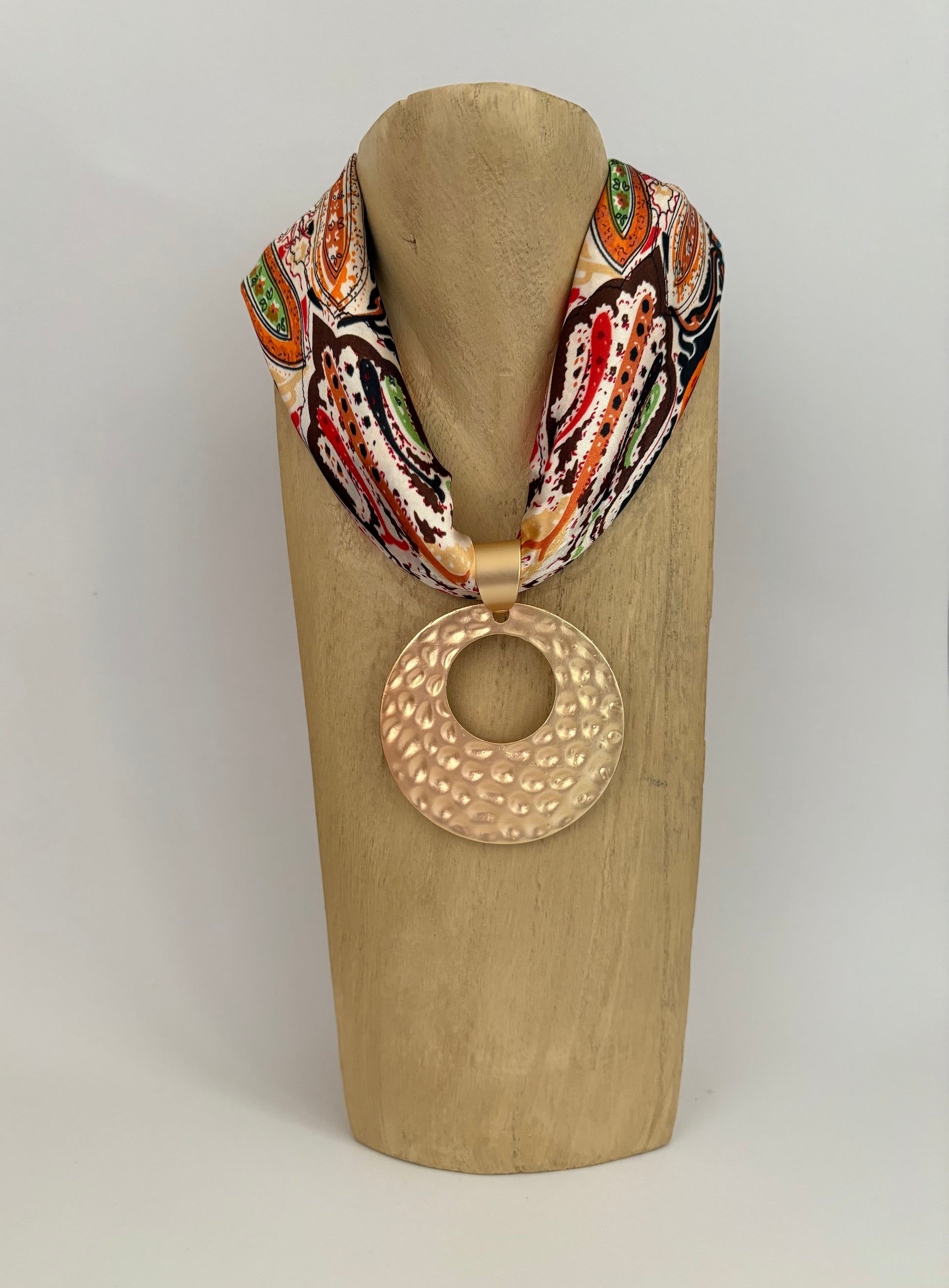 A: Each necklace is hand-assembled, so the placement of the fabric may vary slightly from the photos. However, the scarf used is always the exact same one shown on the website.